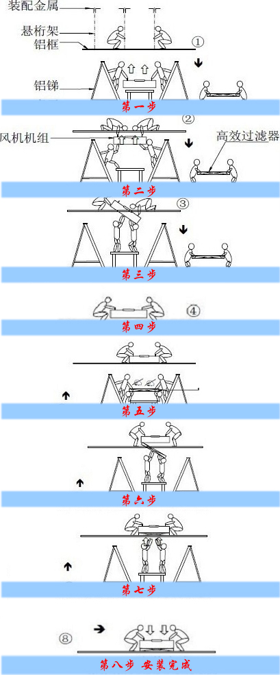 在天花板上的兩位人員把FFU抬起來,潔凈室內(nèi)的兩位工作人員踩著桌子把過濾器傾斜傳遞到龍骨上(高效過濾器應(yīng)處在迎風(fēng)面方向),由于高效過濾器的濾芯是非常脆弱、易損的,所以在安裝傳遞過程中只能握緊它的邊框,輕拿輕放,不能接觸其內(nèi)部的濾芯,堅(jiān)決避免碰撞濾芯。