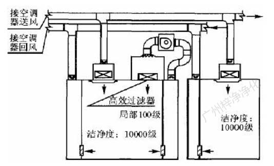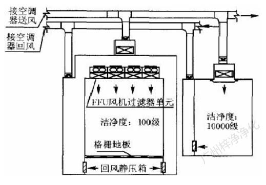 此方式的缺點是設(shè)置循環(huán)風機箱及處理噪聲,需要較大的空間,而通常百級區(qū)周圍風管都比較密集,需要精心布局。此方式百級區(qū)上部靜 壓箱相對百級區(qū)室內(nèi)為正壓,頂棚高效過濾器與吊架間的滲漏,為靜壓箱流向室內(nèi),直接影響百級區(qū)潔凈度。對施工質(zhì)量要求較高。(具 體可參考: