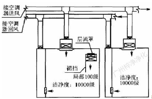 為了提高局部百級區(qū)氣流垂直層流效果,可以根據(jù)現(xiàn)場工藝設(shè)備高度及操作要求,適當降低局部百級區(qū)吊頂,或在潔凈區(qū)吊頂下直接拼裝 百級層流罩,并在百級區(qū)邊界處裝抗靜電塑料裙擋,如圖5。