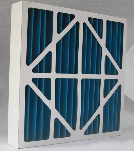 過濾材料是以折疊形式裝入高強度摸且硬紙板內,迎風面積增大,流入的空氣中的塵埃粒子被過濾材料有效阻擋在摺與摺之間。潔凈空氣從另一面均勻流出。因此氣流通過過濾網是平穩和均勻的。視過濾濾料不同。它所攔截粒子的粒經從0.5um到5um而不同。過濾效率也不同。