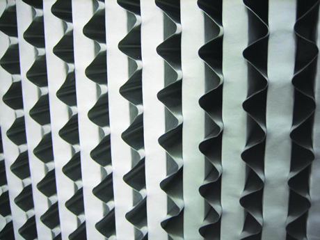 過濾器濾材兩面180度翻折,形成鍥形褶層。濾料折彎時有兩道壓痕,使其在隔板的尾端處形成鍥形盒式摺層,鍥形盒式褶層可以防止濾料破損。有些過濾器生產商采用了單壓痕或滾痕式濾料褶層,甚至簡單地人工折紙,在這種惰況下,濾料很容易被波紋形隔板尖銳的折頂損壞。或在過多搬運過程中損壞濾紙。