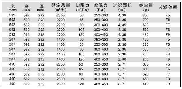 效率:大氣塵比色法平均過濾效率:45%,65%,85%,95%